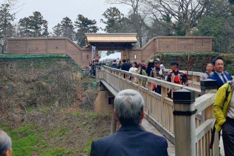 戦国期の威風をまとう高さ約4mの「高麗門」が披露され、関係者や地元の子どもたちが完成を祝いながら、開門式や通り初めを執り行いました。